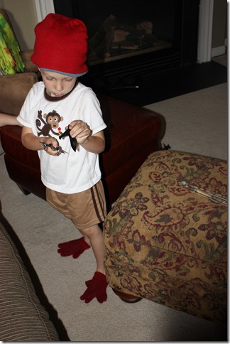 Here is my silly boy. He found his winter hat and gloves in his dresser and put the gloves on his feet so he could be a bird. When he walked around with his little “bird feet” he looked SO funny!